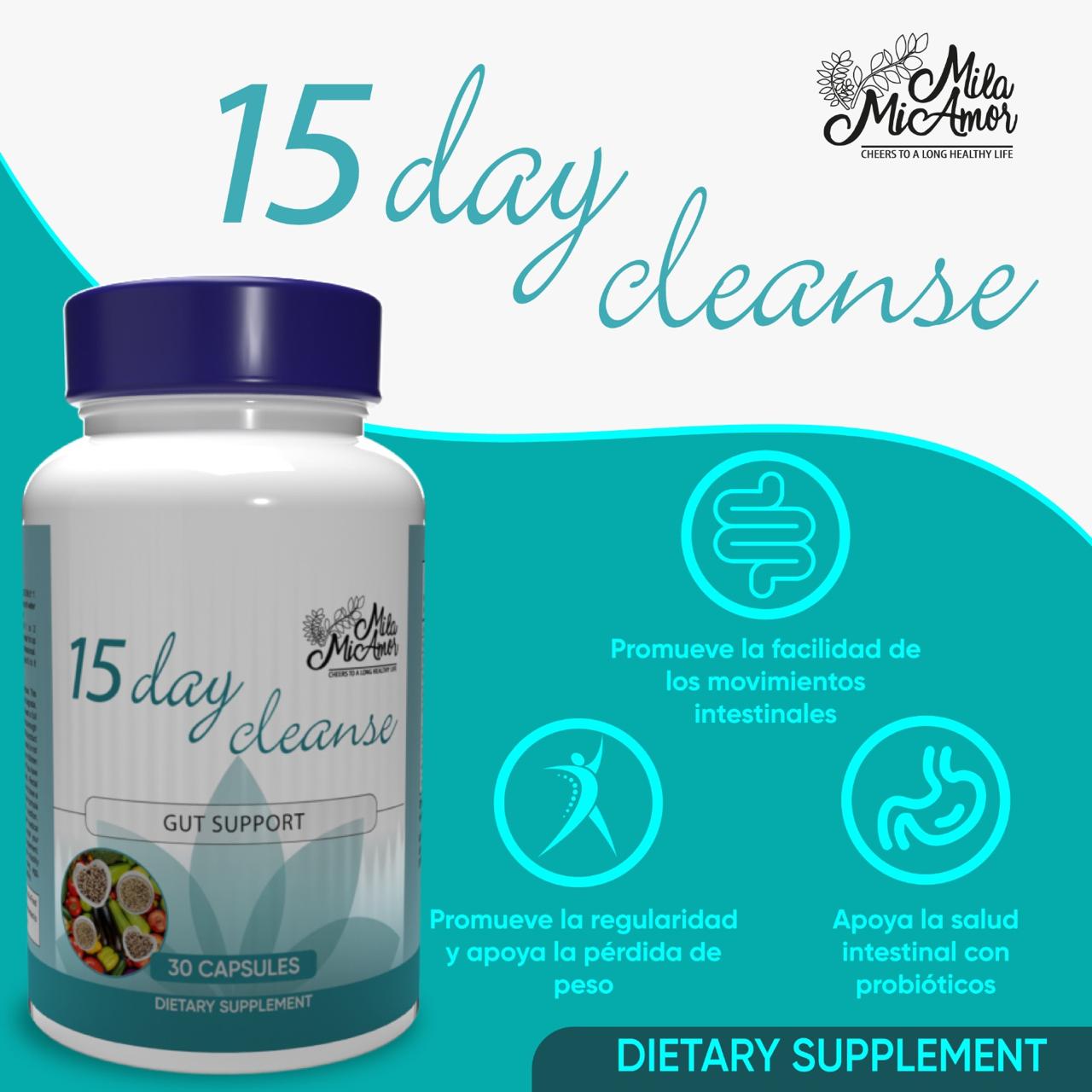 ✨ 15 Days Cleanse es un detox natural diseñado para limpiar tu sistema digestivo de manera efectiva y sin molestias. Su fórmula herbal ayuda a promover la regularidad intestinal, eliminar la hinchazón y mejorar tu salud digestiva en solo 15 días.