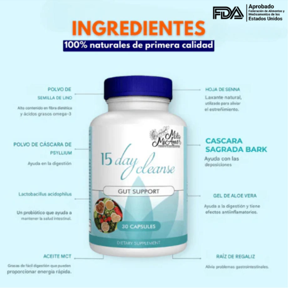 🍃 15 Days Cleanse actúa como un detox natural, eliminando residuos digestivos y ayudando a desinflamar tu cuerpo, para que te sientas liviano, renovado y con más energía.